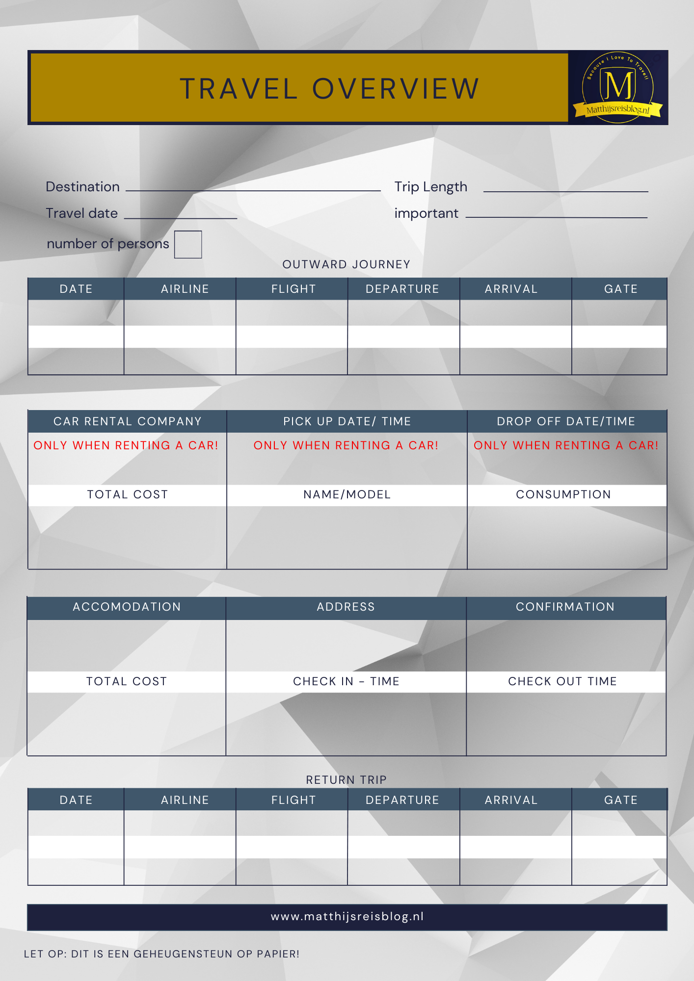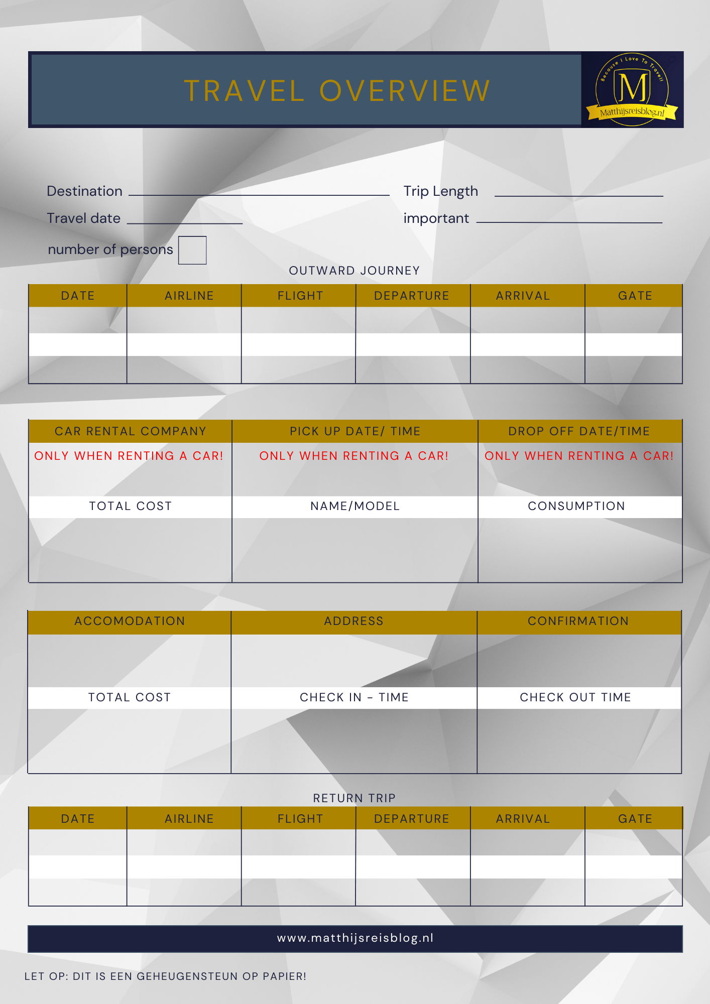 Zorg dat je alles overziet. Daarom heb ik hier goede documenten. Dit is een Travel Overview. Dit document geeft je een overzicht met jouw plannen, denk aan de gehuurde auto, het bedrijf, de heenvlucht en de terugvlucht. DIt document kan je bij je houden als je wat vergeten bent. Voor je op reis gaat kan je dit even doornemen zodat je alles op een rijtje hebt. Let op dit document is een geheugensteun.
